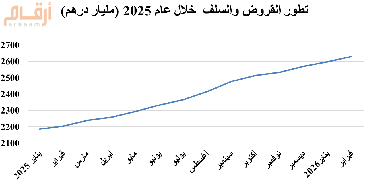 وارتفع إجمالي الائتمان إلى 2630.6 مليار درهم بنهاية فبراير الماضي، وبنسبة 19.3% مقارنة بنفس الفترة من عام 2025، في حين ارتفع بقيمة 32.4 مليار درهم مقارنة بالشهر الذي سبقه.