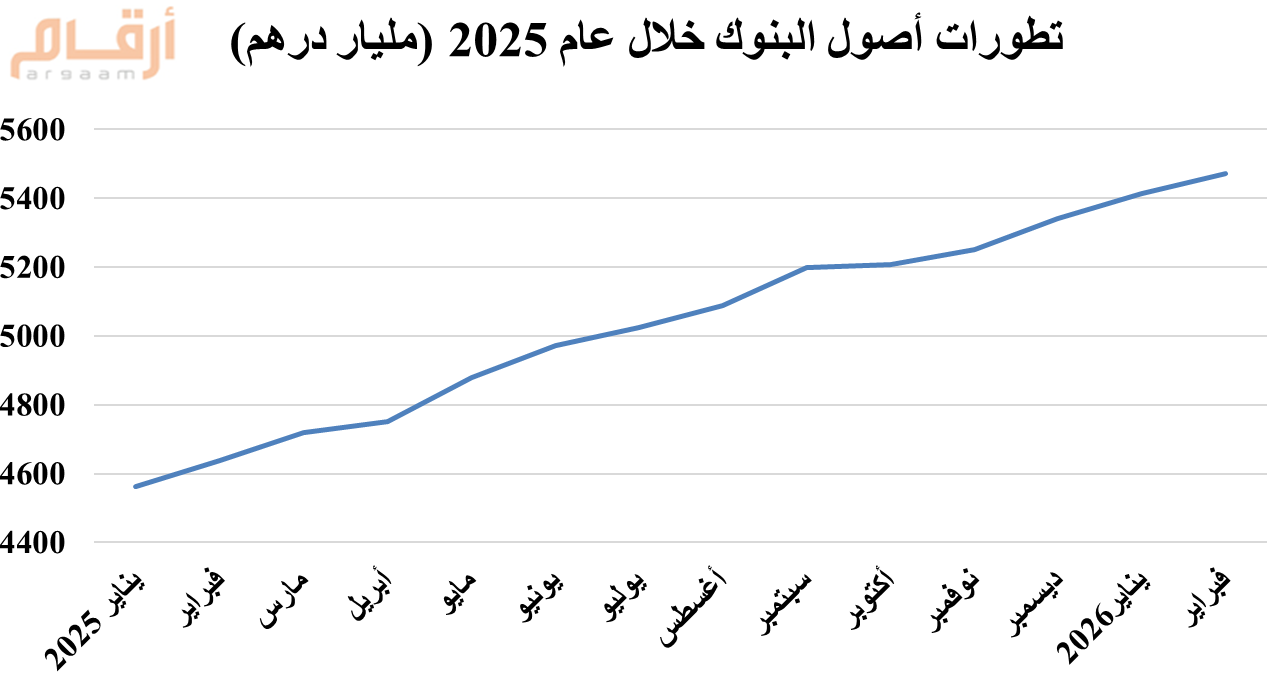 ارتفعت أصول البنوك في الدولة إلى 5472.5 مليار درهم بنهاية شهر فبراير 2026، وبنسبة 18% مقارنة بشهر فبراير من العام 2025، وارتفعت بنحو 58.9 مليار درهم مقارنة بالشهر الذي سبقه.