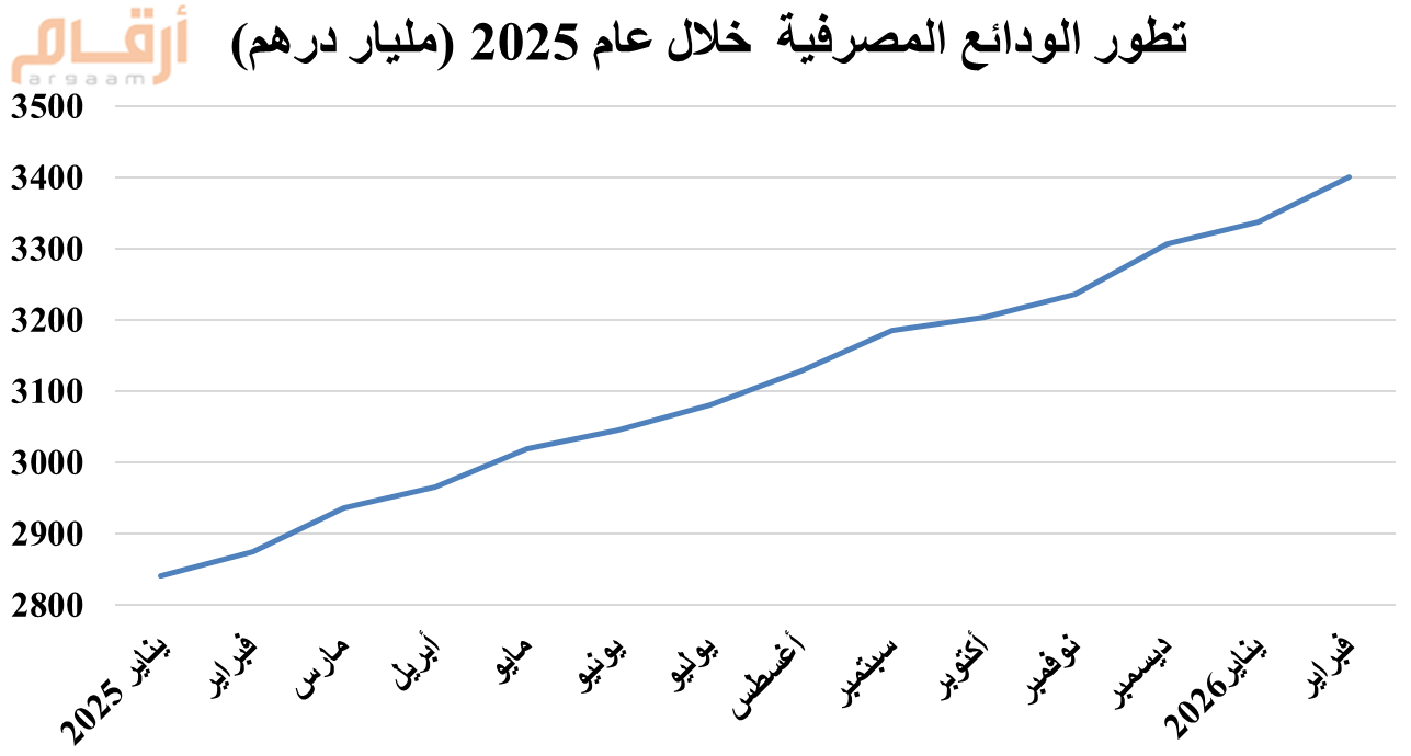 ووفقا لأحدث إحصائيات مصرف الإمارات المركزي، ارتفعت الودائع المصرفية إلى 3400 مليار درهم بنهاية فبراير 2026، وبـنسبة 18.4% مقارنة بنفس الفترة من عام 2025، وارتفعت بقيمة 63.2 مليار درهم مقارنة بشهر يناير الماضي.