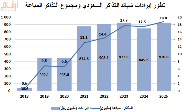وسجل القطاع نموًا ملحوظًا منذ عام 2018، حيث ارتفعت الإيرادات من نحو 39 مليون ريال إلى 920.8 مليون ريال، وزاد عدد التذاكر المبيعة من 600 ألف إلى 18.8 مليون تذكرة في 2025، كما يوضح الجدول أدناه تطور إيرادات شباك التذاكر السعودي ومجموع التذاكر المبيعة: