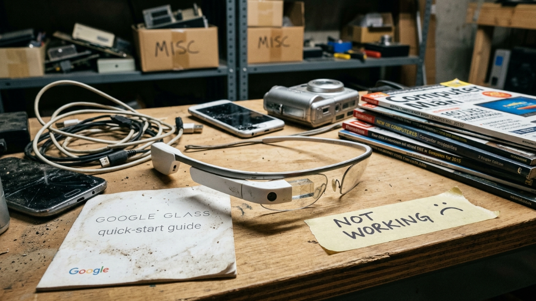"جوجل جلاس" نظارة ذكية رفيعة بدون عدسات بذراع يمنى سميكة لاستيعاب كاميرا مدمجة، تعمل بنظام التشغيل "أندرويد"، تعرض المعلومات والتطبيقات على شاشة صغيرة أمام عين المستخدم، وكانت بمثابة حاسوب في هيئة نظارة، ورغم أنها تُعدّ إنجازًا تقنيًا هائلاً، فإنها فشلت في تحقيق النجاح المأمول بسبب أخطاء تسويقية وإشكاليات تصميمية ومخاوف تتعلق بالخصوصية.