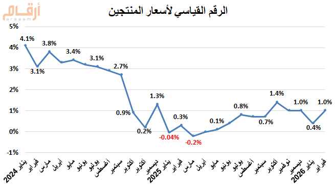 سجل الرقم القياسي لأسعار المنتجين في المملكة ارتفاعاً خلال شهر فبراير 2026 بنسبة 1 % مقارنة بنظيره من عام 2025.