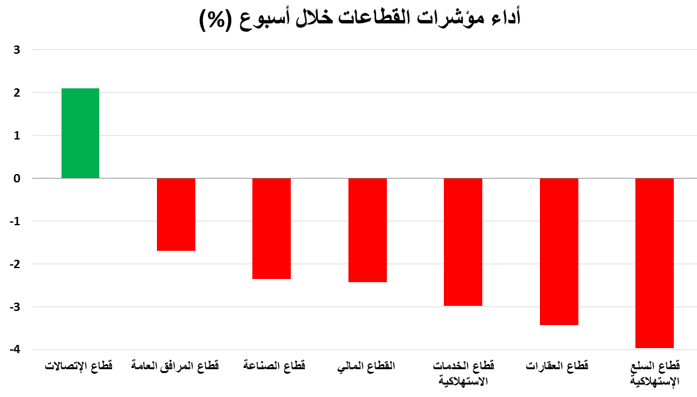 وفي المقابل، ارتفع مؤشر قطاع الاتصالات منفردًا بنسبة 2.1%، بينما استقر مؤشر قطاع المواد الأساسية دون تغيير مقارنة بمستواه في الأسبوع السابق.