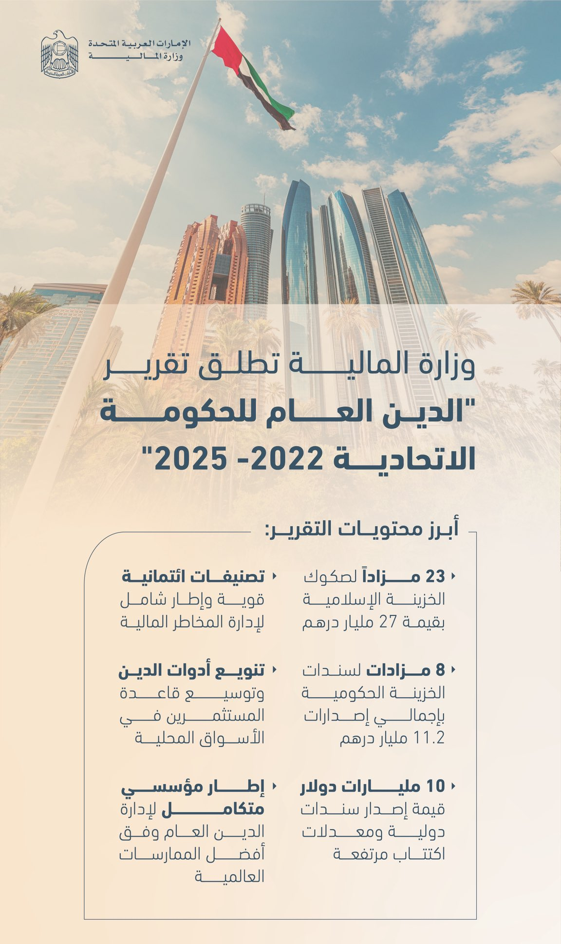 وأوضح عبر منصة إكس، أنه تم طرح 23 مزاداً لصكوك الخزينة الإسلامية بقيمة إجمالية بلغت 27 مليار درهم، و8 مزادات لسندات الخزينة الحكومية بإجمالي إصدارات بلغت 11.2 مليار درهم حتى نهاية ديسمبر 2025.