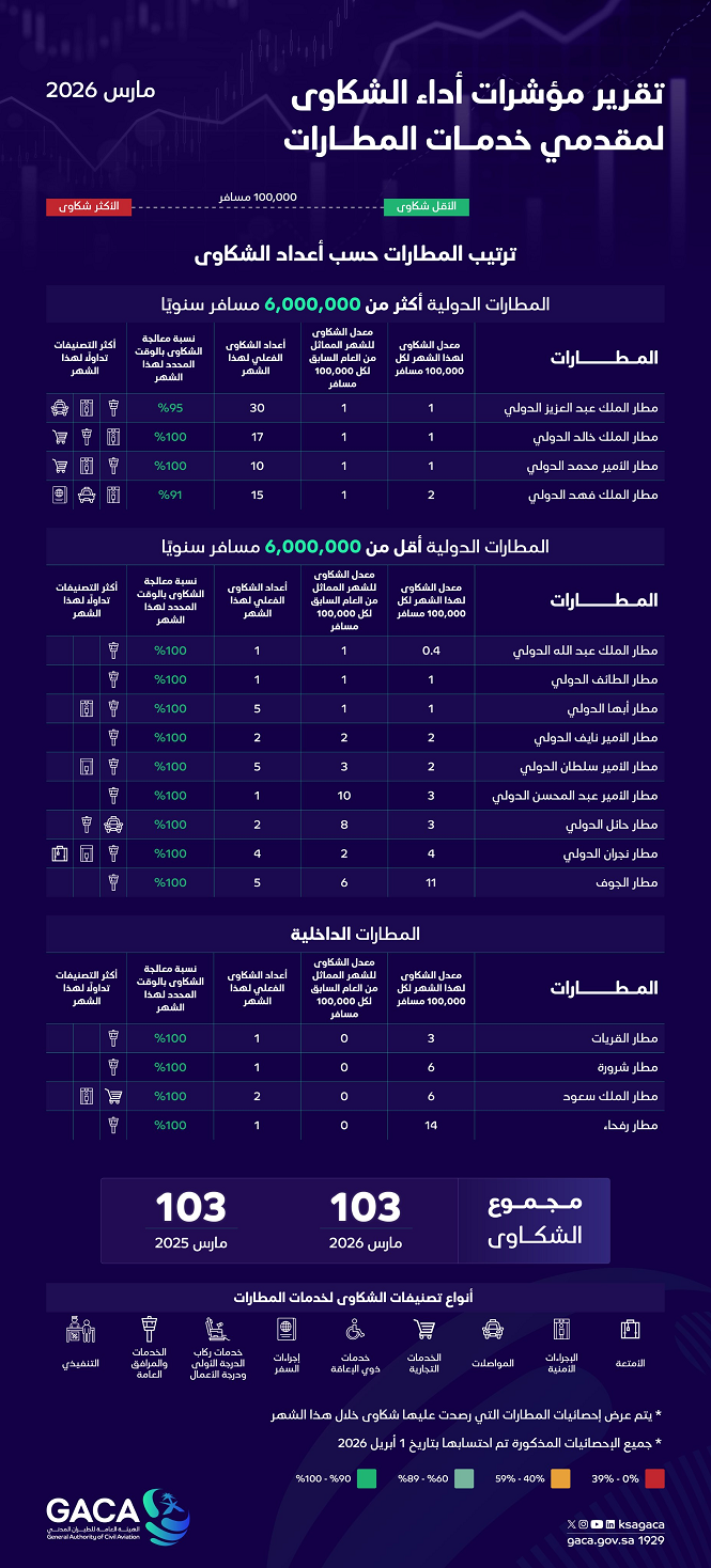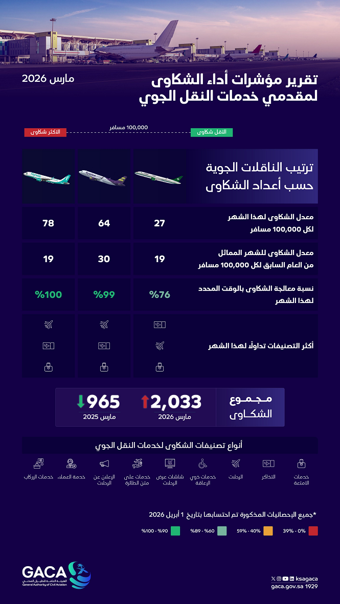 2033 إجمالي عدد شكاوى المسافرين على الناقلات الجوية السعودية في مارس 2026