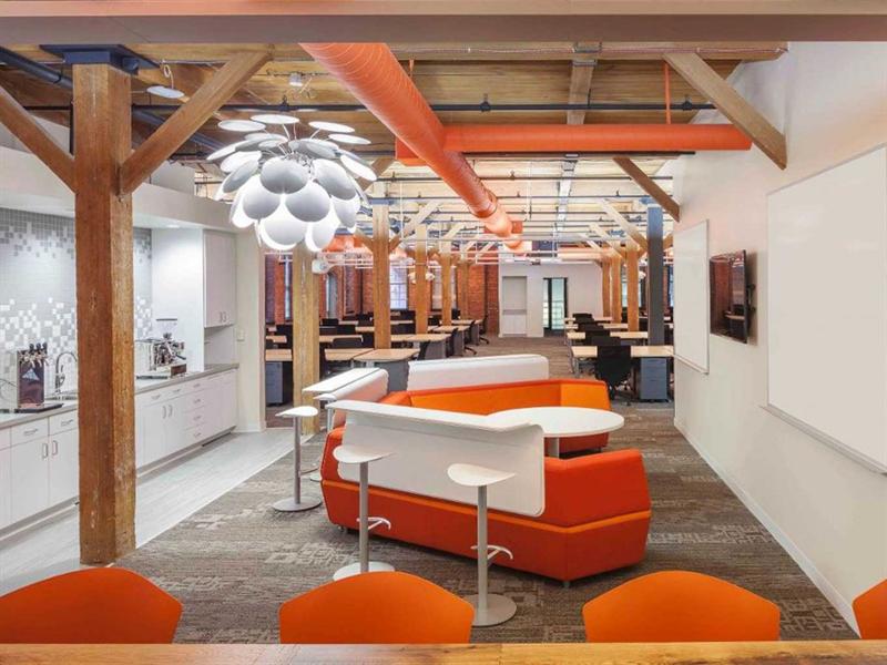 تستخدم شركة تطوير وتسويق البرمجيات "هاب سبوت" التصميمات العصرية لإضفاء أجواء من البهجة والانتعاش لموظفيها، وهو ما يظهر في الألوان البراقة التي تستخدمها في ديكورات قاعة الاستراحة بها.