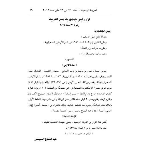 ونشرت الجريدة الرسمية المصرية الصادرة أمس الخميس قرار السيسي باعتماد ملكية المواطن السعودي حمود بن محمد بن ناصر الصالح، لقطعتي الأرض اللتين اشتراهما من أبناء وبنات المواطن المصري عبدالفتاح محمد إدريس.