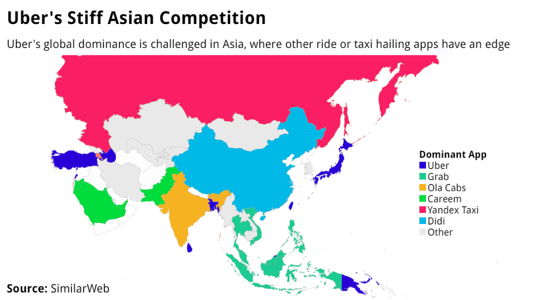 في غضون ذلك، تفوقت شركة "Grab" السنغافورية في جنوب شرق آسيا واحتلت المرتبة الأولى في ست دول، كما ذاع صيت شركة "Careem" في الشرق الأوسط.