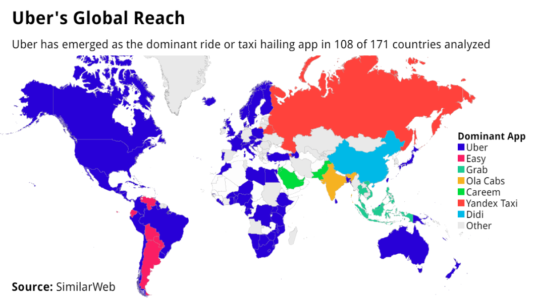 أظهرت إحصائية أجرتها "SimiarWeb" التي تتبع تطبيقات خدمة التوصيل في 171 دولة حول العالم عبر الجوال أن تطبيق شركة "أوبر تكنولوجيز" هو الأكثر شعبية في حوالي 108 دول في قارات أمريكا الشمالية وأوروبا وإفريقيا وأمريكا الجنوبية.