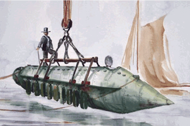 - صمم هذه الغواصة المخترع الأمريكي من نيوجيرسي "أوليفر هالستيد" واستخدمت أيضا أثناء الحرب الأهلية في أمريكا وبدأ تدشينها عام 1862 واستغرق الأمر عشر سنوات قبل اختبارها، لتنتهي الحرب الأهلية قبل تشغيلها.