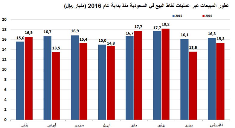 | السعودية: انخفاض المبيعات عبر نقاط البيع إلى 13.6 مليار ريال (- 16%) خلال يوليو.. والسحوبات النقدية إلى 55 مليار ريال |