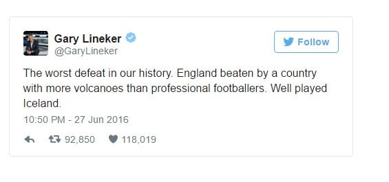 أصبح فوز آيسلندا على إنجلترا في بطولة كأس الأمم الأوروبية (يورو 2016) الحدث الأعلى تغريدًا في المملكة المتحدة متجاوزًا "البريكست".