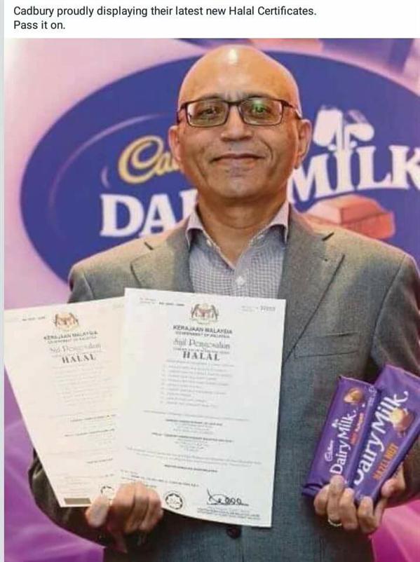 وظهرت صورة لشخص يحمل شهادة تؤكد أن منتجات شيكولاتة "كادبوري" حلال، ووفقا لتقرير نشرته "مترو"، فإن الصورة يرجع تاريخها لعام 2014، وظهرت في مقال عن "كادبوري" في ماليزيا وتساؤلات حينها بشأن ما إذا كانت الشيكولاتة الشهيرة تحتوي على الحمض النووي "دي إن إيه" للخنزير من عدمه لتظهر الصورة وتنفي وجود هذه المواد.