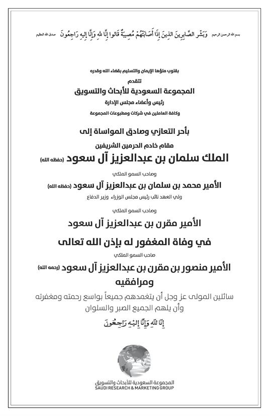 ببالغ الحزن والأسى تتقدم  "أرقام" بأحر التعازي والمواساة الى مقام خادم الحرمين الشريفين الملك سلمان بن عبدالعزيز –حفظه الله والى ولي العهد الامير محمد بن سلمان –حفظه الله، والى الأمير مقرن بن عبدالعزيز، في وفاة الأمير منصور بن مقرن بن عبدالعزيز نائب أمير منطقة عسير -رحمه الله-، ونسأل الله العلي القدير أن يتغمد الفقيد بواسع رحمته ومغفرته وأن يجعل مثواه الفردوس الأعلى من الجنة وأن يلهمنا الصبر والسلوان " إنا لله وإنا إليه راجعون".