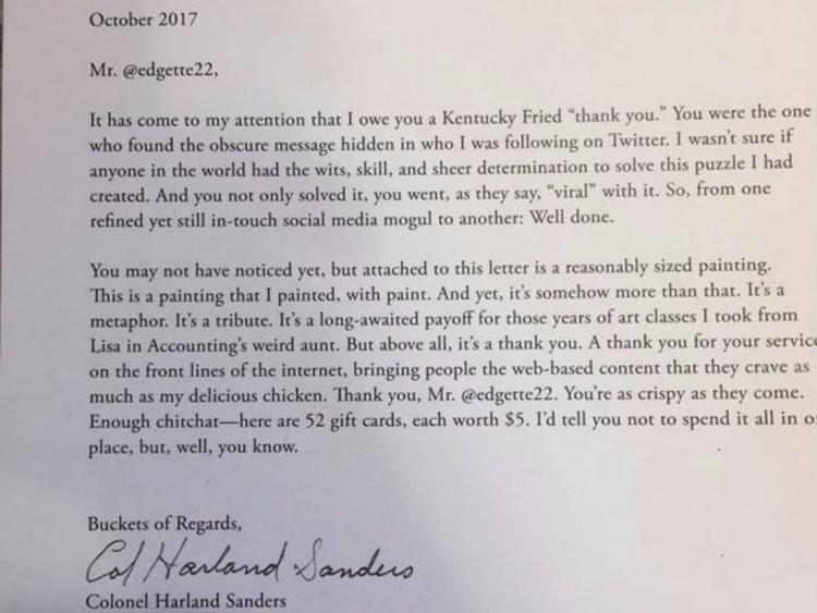 وأرفقت الشركة باللوحة المرسومة خطابا موقعا من الكولونيل "ساندر" بالإضافة على 52 بطاقة قيمة الواحدة خمسة دولارات.