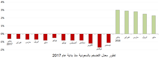 كشفت بيانات الهيئة العامة للإحصاء عن ارتفاع معدّل التضخم بالمملكة العربية السعودية عند 2.3 % خلال شهر مايو 2018.