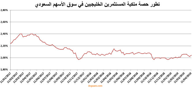 وحسب المسح الذي أجرته "أرقام"، فقد تراجعت ملكية الخليجيين بشكل تدريجي خلال عام 2017، بعد أن وصلت إلى مستوى 2.40% في أبريل 2017، لتبلغ ملكيتهم في المتوسط 2.06% خلال عام 2018.