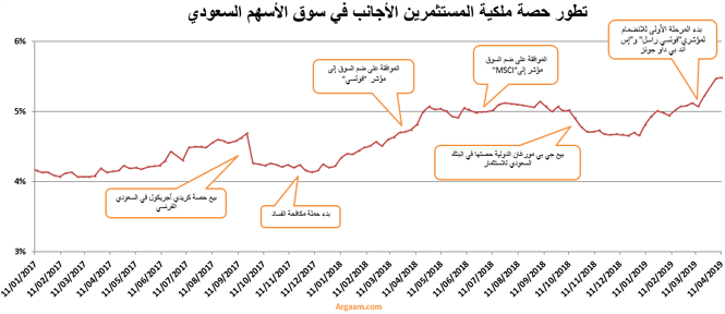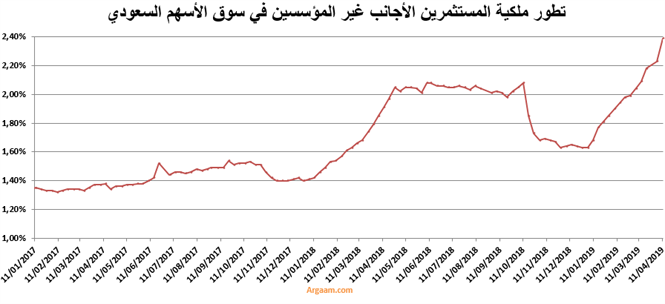 ارتفعت استثمارات الأجانب غير المؤسسين بالسوق السعودي خلال الأسبوع المنتهي في 11 أبريل 2019 إلى 2.39% من إجمالي السوق، مقارنة بـ 2.23% بنهاية الأسبوع السابق، وذلك نتيجة لعمليات شراء صافية بلغت نحو 1218 مليون ريال تمت خلال الأسبوع.