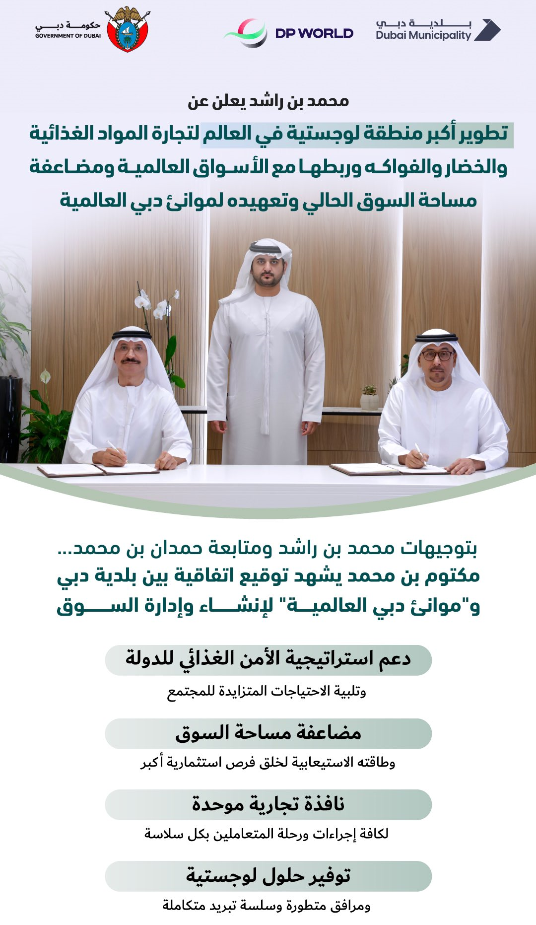وتنفيذاً لذلك جرى توقيع اتفاقية شراكة بين بلدية دبي ومجموعة موانئ دبي العالمية، لإنشاء وإدارة "سوق المواد الغذائية والخضار والفواكه" الأكبر عالمياً.