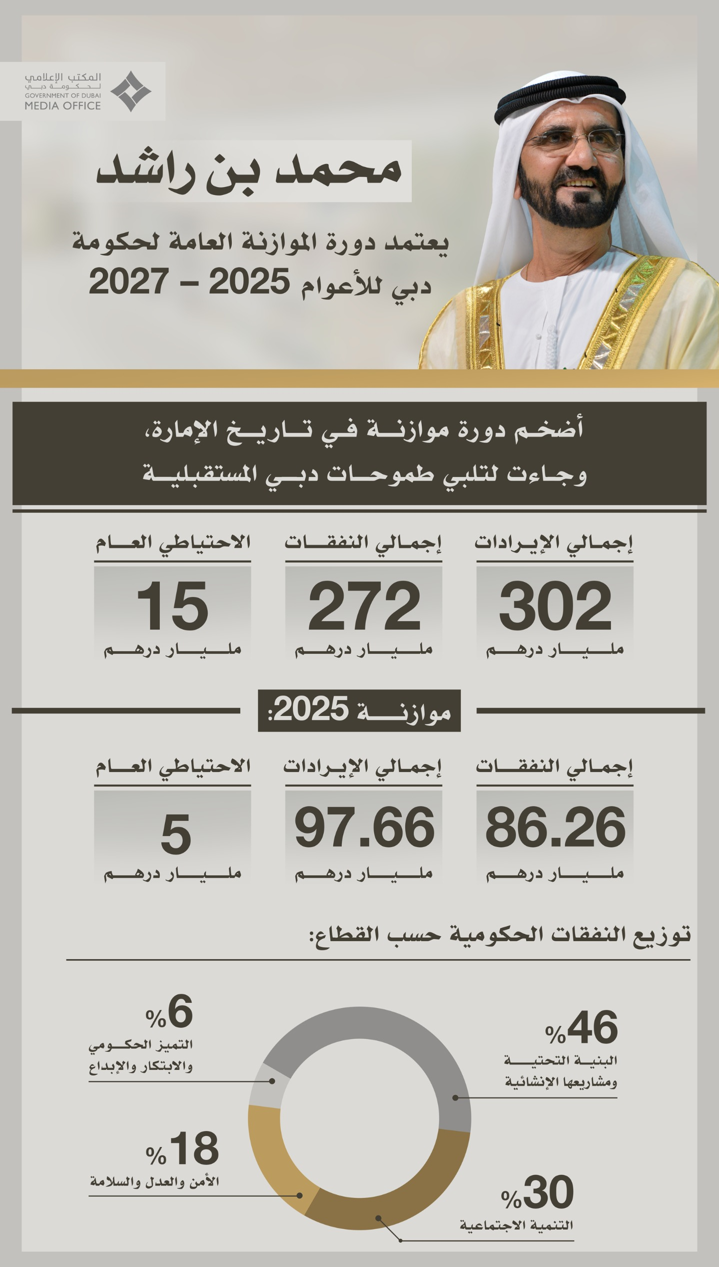 اعتمد الشيخ محمد بن راشد آل مكتوم، نائب رئيس الدولة رئيس مجلس الوزراء، بصفته حاكماً لإمارة دبي، القانون رقم (23) لسنة 2024 بشأن دورة الموازنة العامة لحكومة دبي للسنوات المالية 2025-2027، بإجمالي نفقات قدرها 272 مليار درهم وإجمالي إيرادات قدره 302 مليار درهم، لتُعد هذه الدورة من الموازنة الأضخم في تاريخ الإمارة.