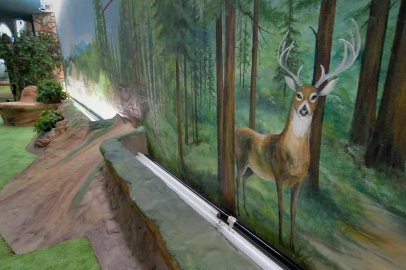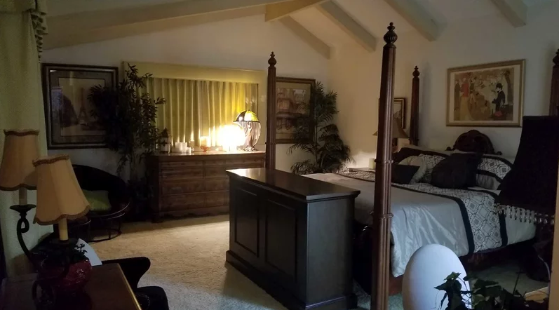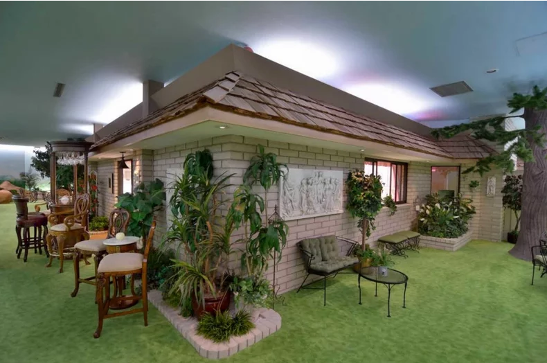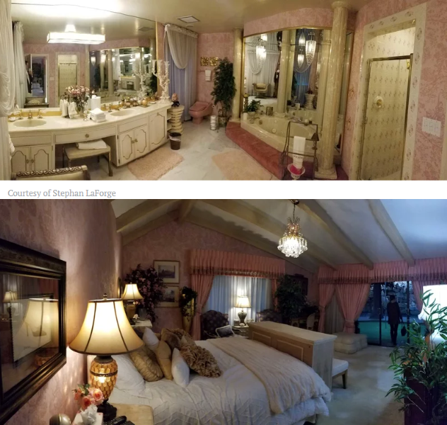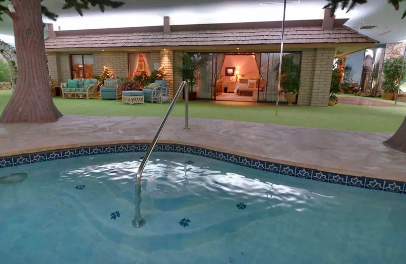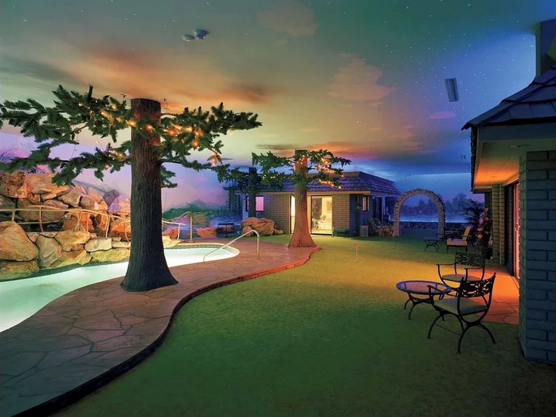 وتوزع المساحة الشاسعة على المبنى الرئيس للقصر ومنزل للضيوف وحمام سباحة، وتم طلاء السقف ليبدو كالسماء كما توجد مساحات خضراء ونباتات مختلفة.