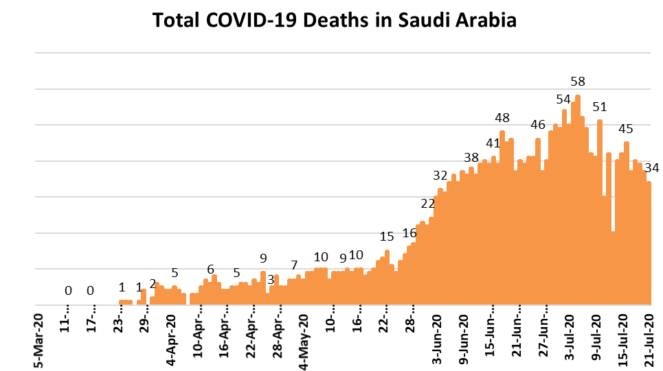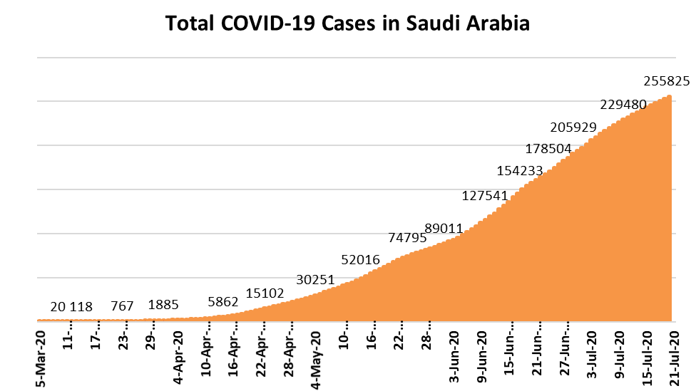 The total number of coronavirus cases in Saudi Arabia increased by 2,476 to 255,825 as of Tuesday, July 21, the Ministry of Health announced today.