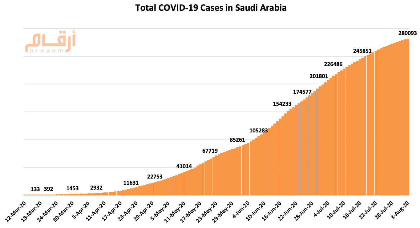 The total number of coronavirus cases in Saudi Arabia increased by 1,258 to 280,093 on Monday, August 3, the Ministry of Health announced today.