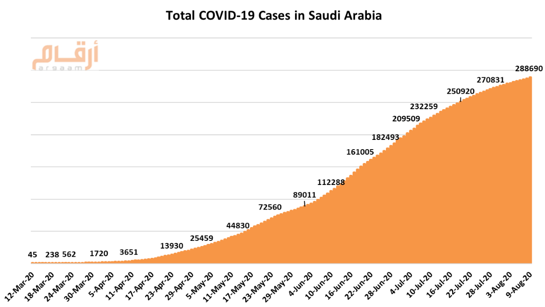 The total number of coronavirus cases in Saudi Arabia increased by 1,428 to 288,690 on Sunday, August 9, the Ministry of Health announced today.