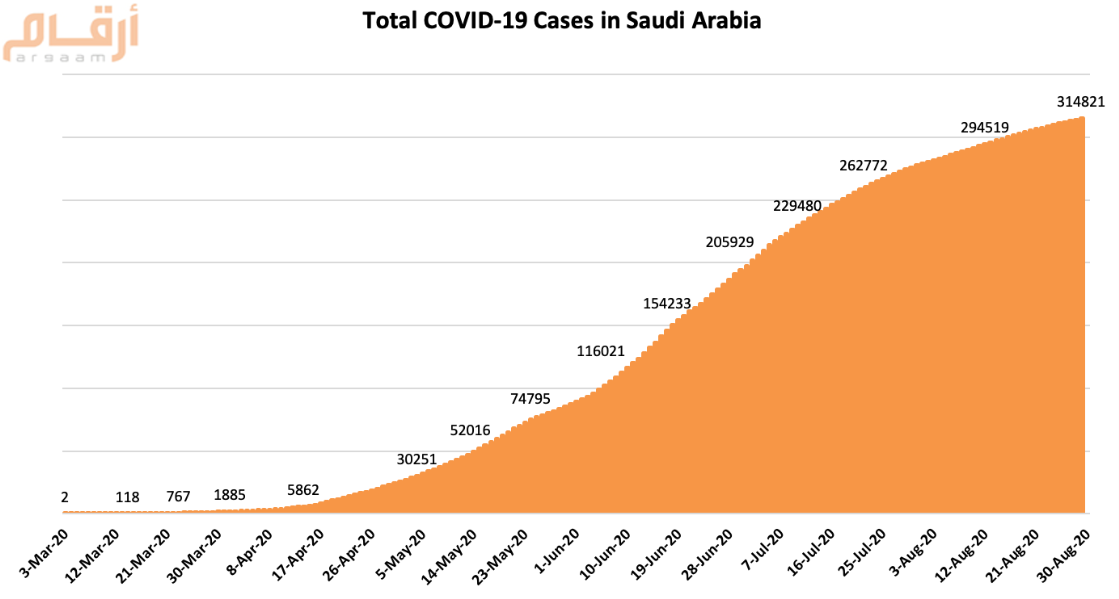 Saudi Arabia recorded 910 new COVID-19 cases today, Aug. 30 bringing the total number of confirmed cases to 314,821, the Ministry of Health said.