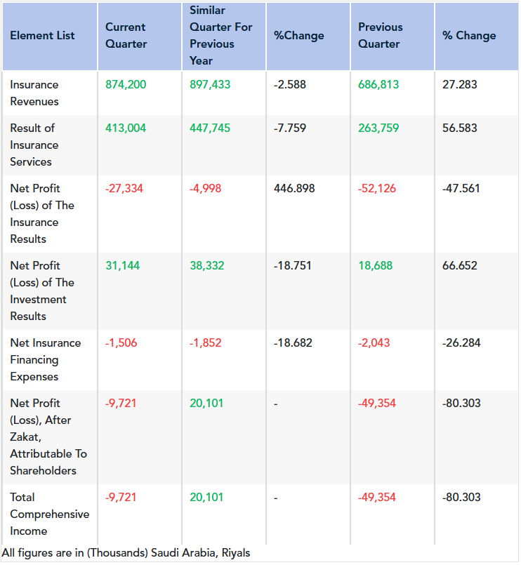 Insurance revenues for the current quarter amounted to SAR 874,200 thousand, compared to insurance revenues amounting to SAR 897,433 thousand of the same quarter of last year. This represents a decrease of 2.59%.