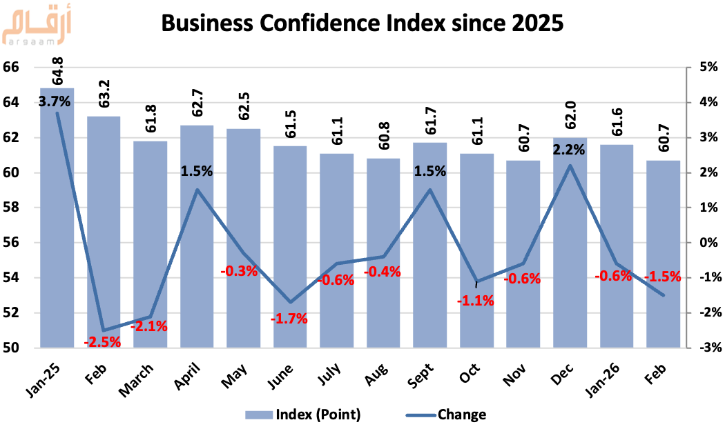 Saudi Arabia’s non-oil Business Confidence Index declined 1.5% month-on-month in February 2026.