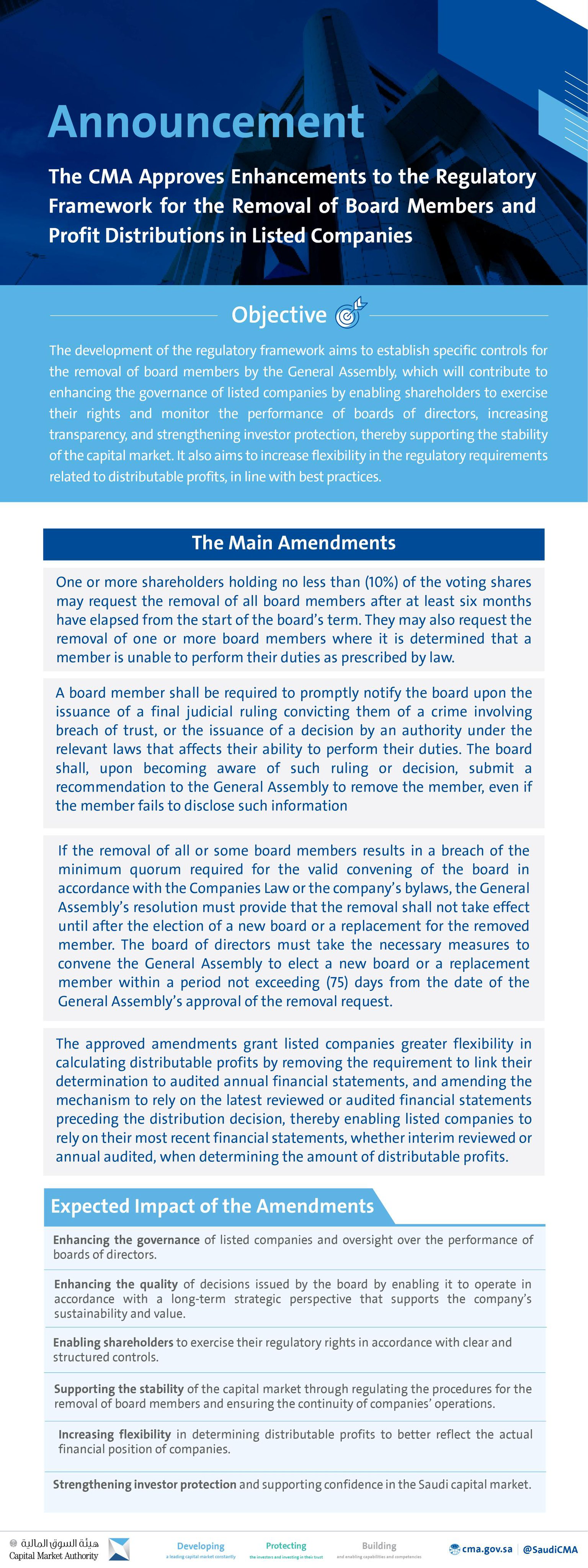 The development of the regulatory framework aims to establish specific controls for the removal of board members by the general assembly, which will contribute to enhancing the governance of listed companies by enabling shareholders to exercise their rights and monitor the performance of boards of directors, increasing transparency, and strengthening investor protection, thereby supporting the stability of the capital market. It also aims to increase flexibility in the regulatory requirements related to distributable profits, in line with best practices, the regulator said in a statement.