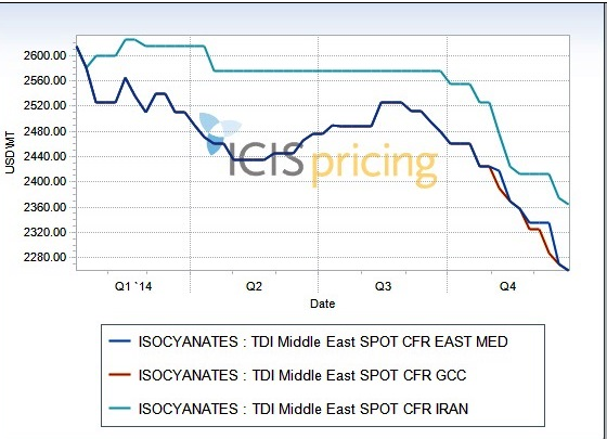 On 13 November flexible polyether polyols fell by $30-60/tonne week on week to $2,350-2,400/tonne CFR Middle East/GCC. By late December prices reached levels at $2,150-2,200/tonne CFR Middle East/GCC, down by $200/tonne in a matter of weeks.